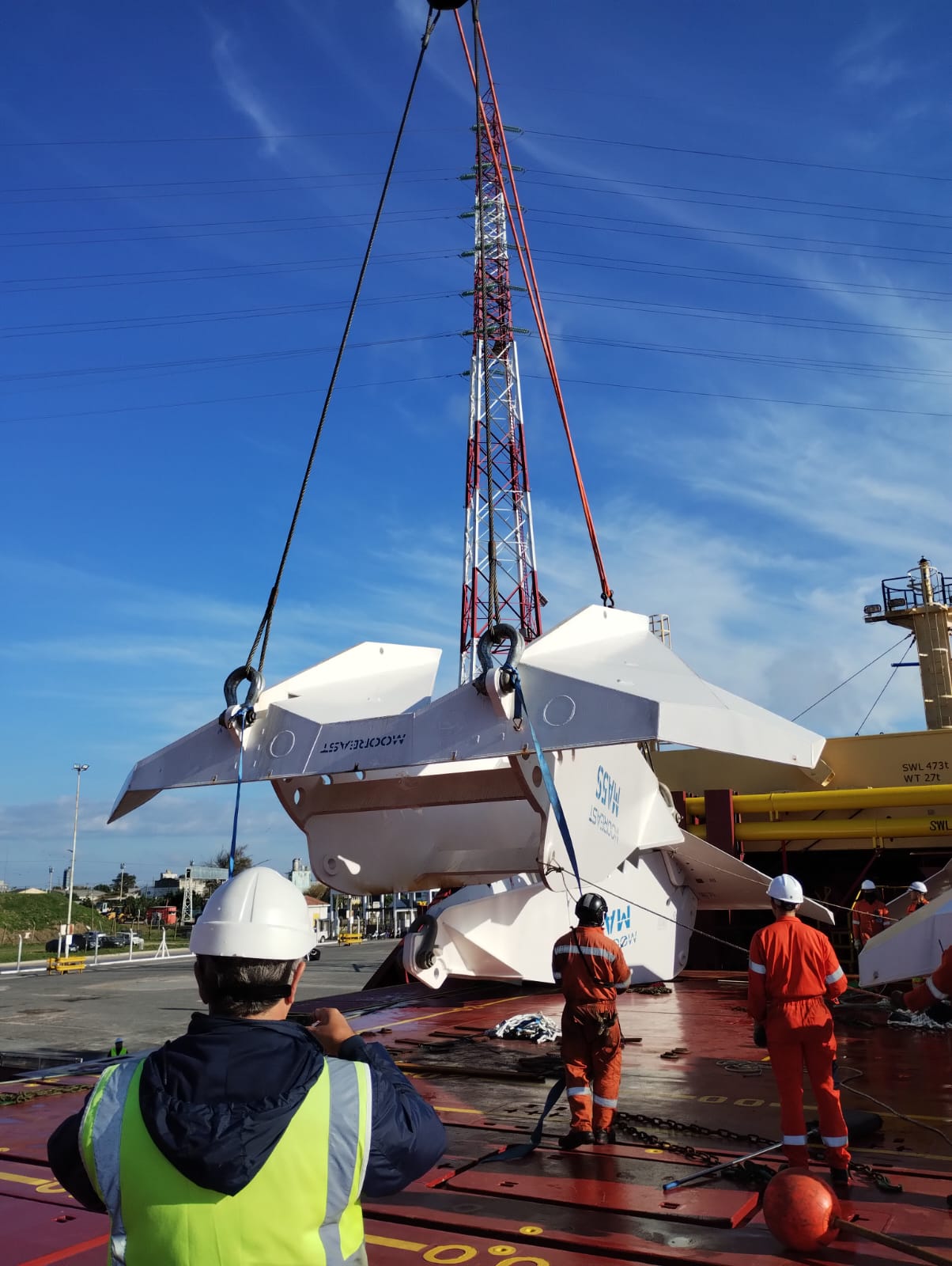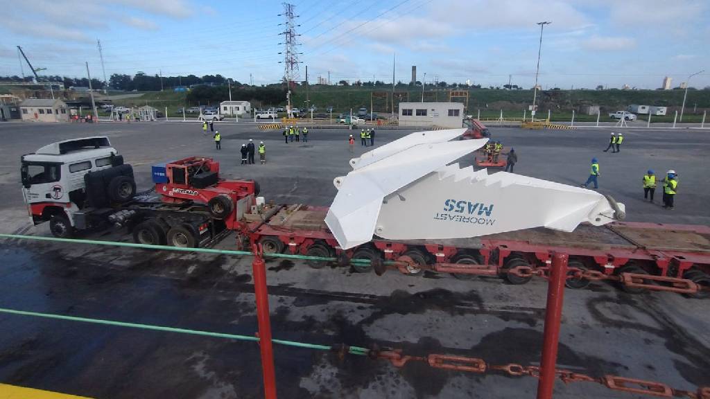 La operatoria incluyó la descarga de 12 anclas de 43 toneladas cada una, junto con unas 900 toneladas de cadenas, elementos fundamentales para el desarrollo de infraestructura offshore vinculada al proyecto.