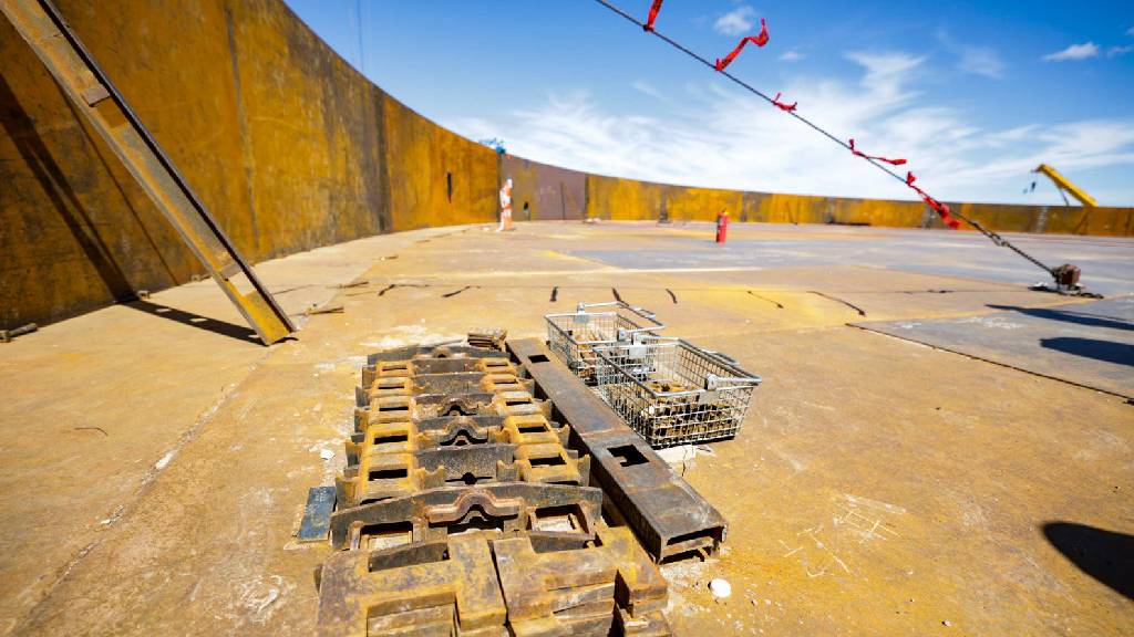 Cada lámina metálica —de 12 metros de largo, 3,5 metros de ancho y 42 milímetros de espesor— está siendo ensamblada mediante un complejo trabajo de soldaduras que involucra a decenas de técnicos y operarios especializados.