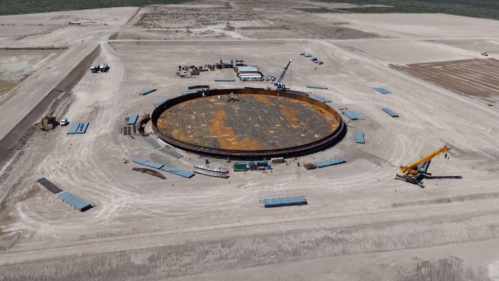 Son seis tanques de acero de gran porte, con capacidad de 120.000 metros cúbicos cada uno, lo que permitirá reunir en conjunto más de 720 millones de litros de crudo para su exportación. El armado comenzó tras el arribo de 8.000 toneladas de chapas de acero procedentes de China, piezas que se descargaron en el puerto y se trasladaron hasta la base de obra.