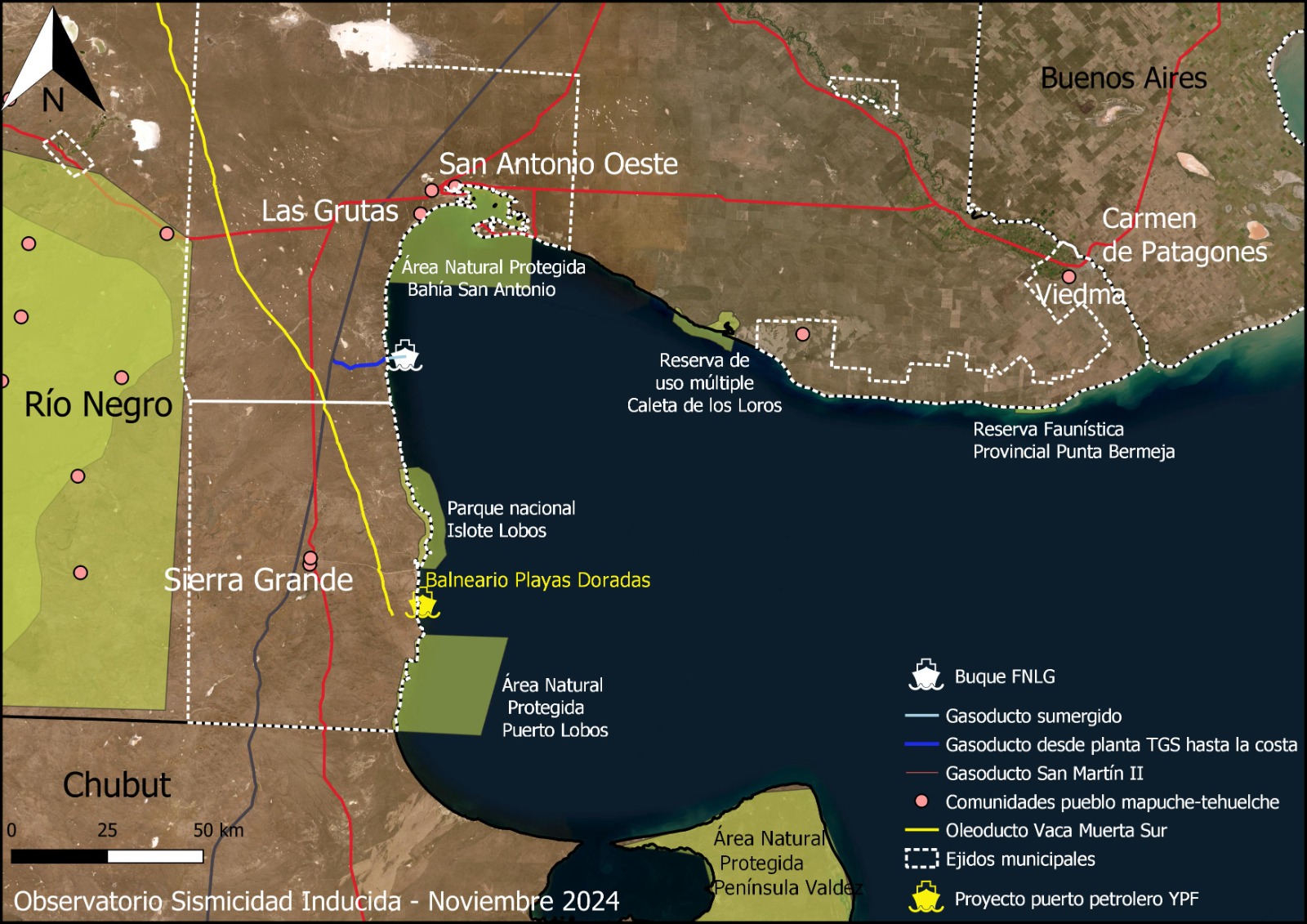 El Estudio de Impacto Ambiental aprobado por Río Negro indica que los barcos estarán fondeados frente a Punta Colorada, a unos 35 kilómetros al sur de Las Grutas.